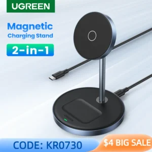 حامل شاحن لاسلكي مغناطيسي UGREEN 20 واط ماكس لهواتف iPhone 15/16 Pro Max وiPhone 14 مع شحن AirPods سريع، تصميم 2 في 1، حماية كاملة وسهولة الاستخدام.
