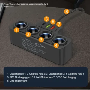شاحن سيارة 12/24 فولت 4 في 1 USB + QC3.0 + PD3.1A، شحن سريع وآمن لجميع الهواتف والأجهزة اللوحية، حماية كاملة وسهولة الاستخدام.
