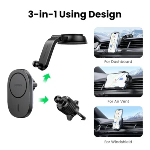 حامل هاتف سيارة مغناطيسي UGREEN مع شاحن لاسلكي 7.5 وات لهواتف iPhone 12/13/14/15/16 Pro Max، تثبيت آمن، شحن سريع، وتصميم عصري للاستخدام داخل السيارة.